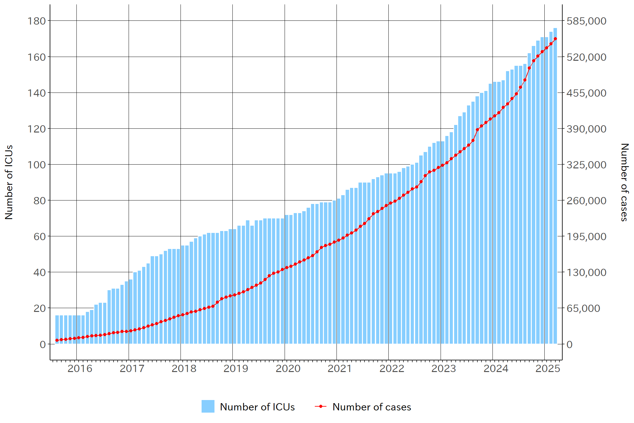 • 2025年3 月31日時点で、157 施設がデータ登録を開始し、累積で552,304例が症例登録されている。