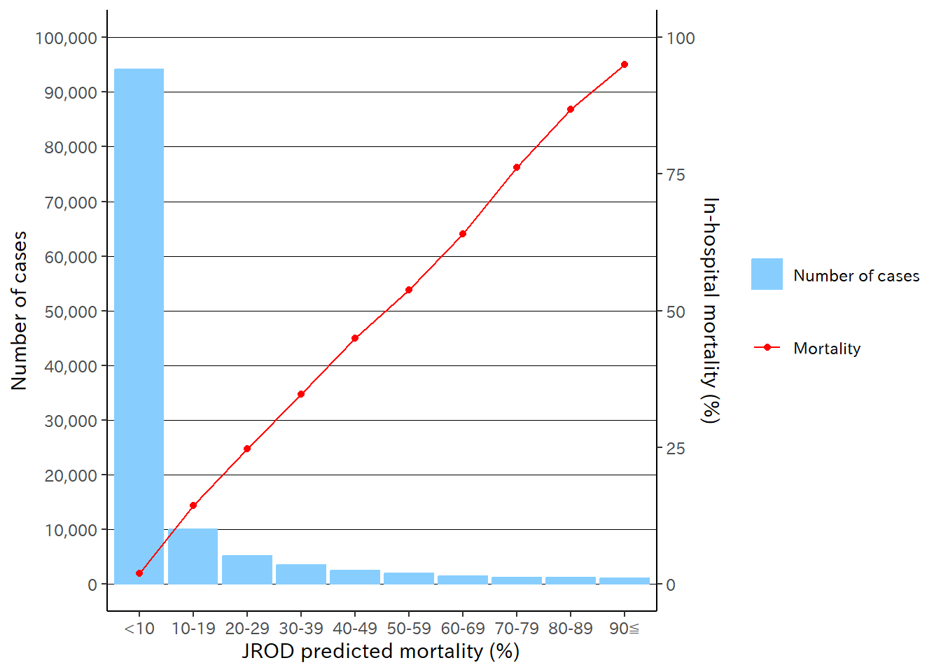 • 横軸は各病院のJROD予測モデルに基づく予測死亡数である。