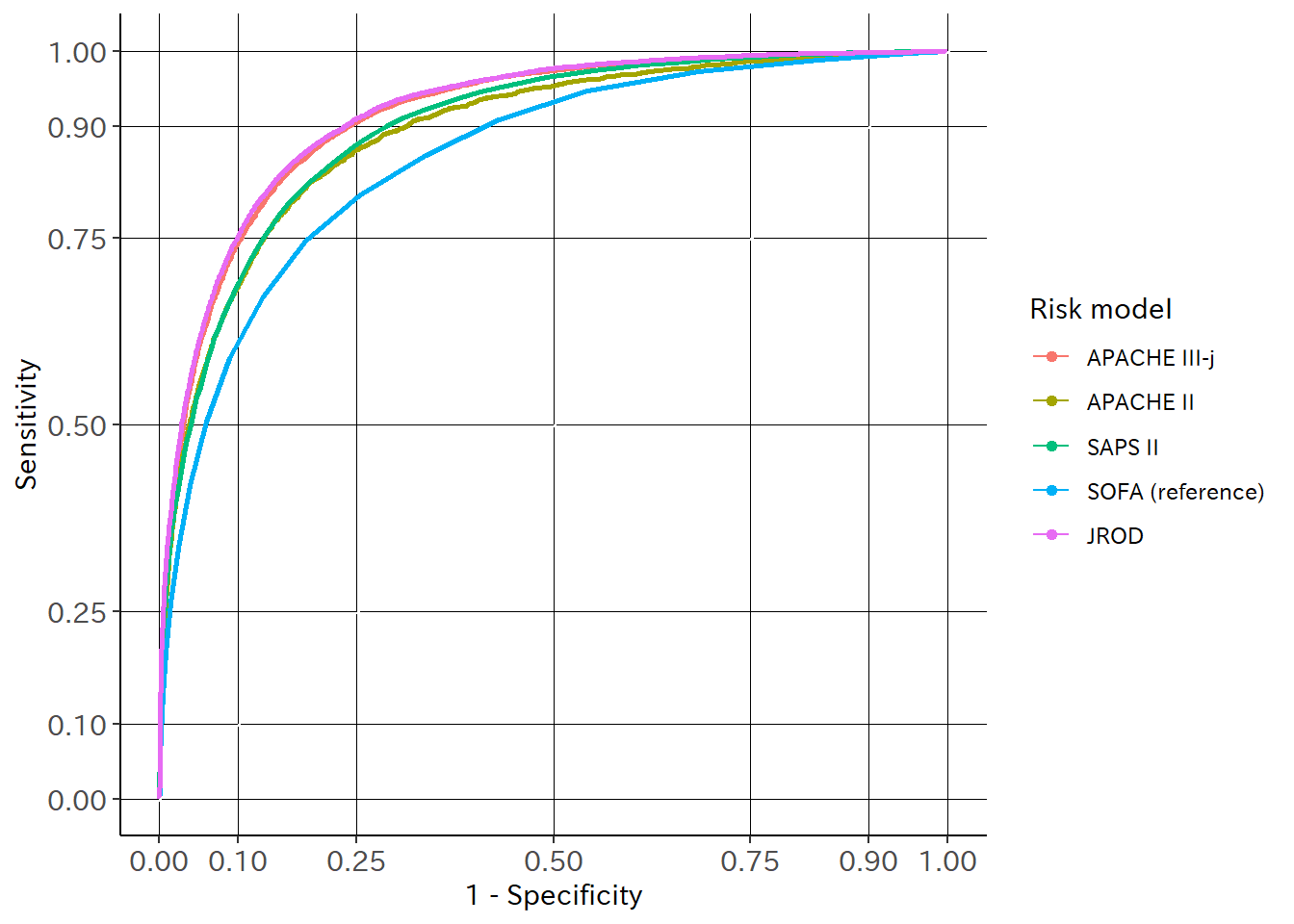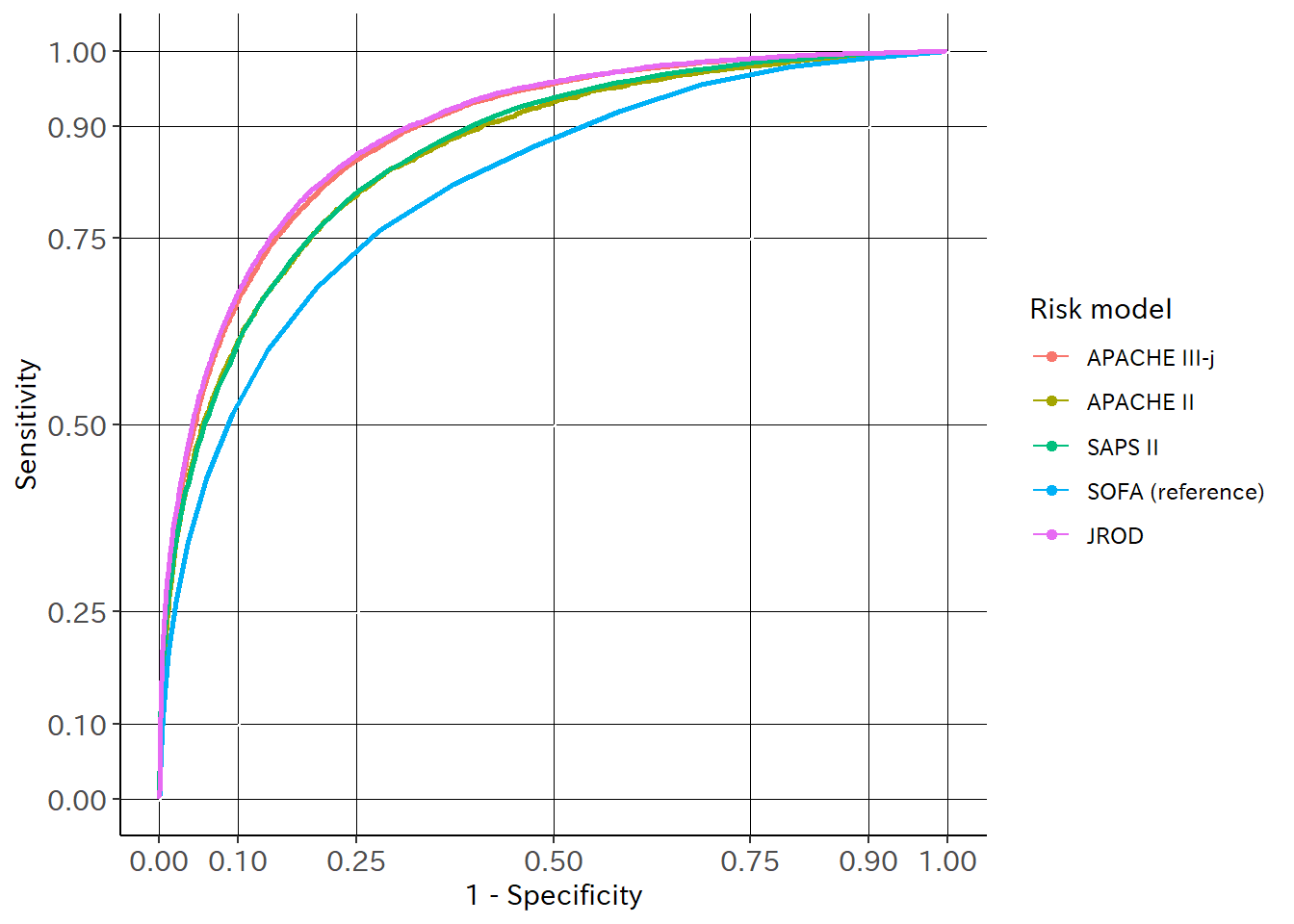 • それ以外のリスクモデルは、標準化死亡比と同様、ROC 曲線下面積も APACHE III-j, SAPS II, APACHE II の順に高値であった。
