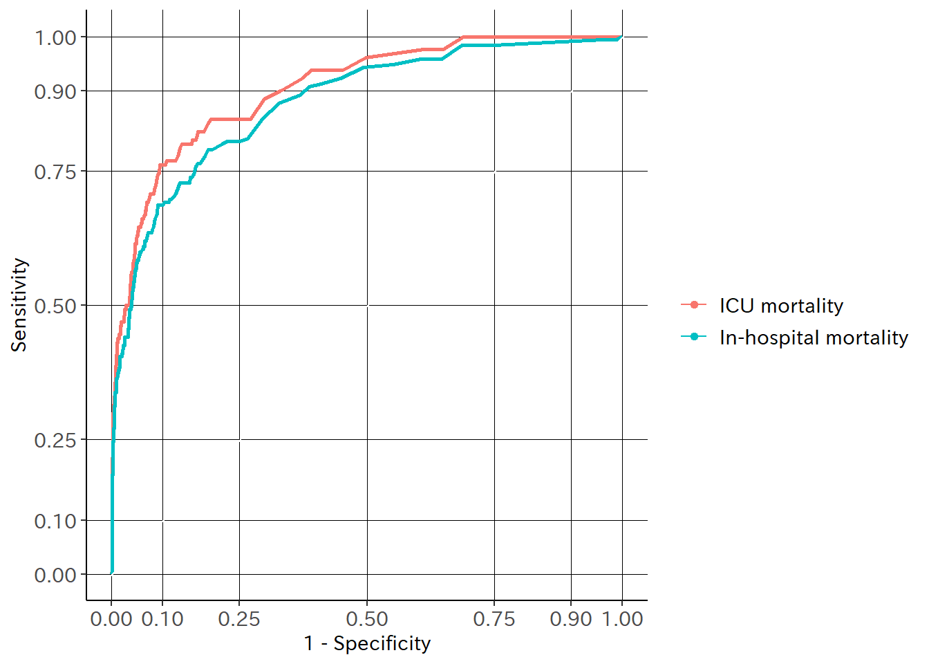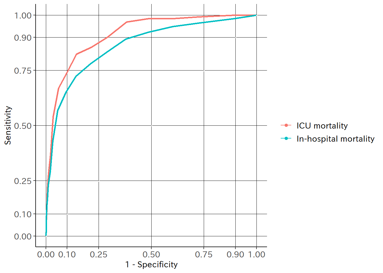 PIM2のROC曲線(ICU死亡、病院死亡)