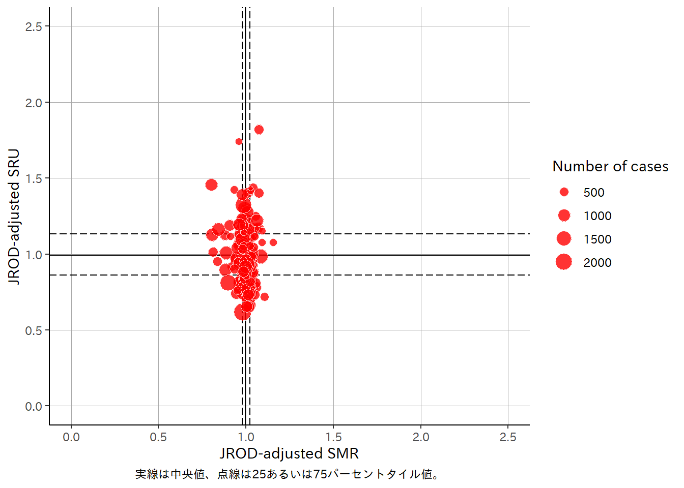 • 縦軸は、実際の死亡数とJROD予測モデルに基づく予測死亡数の比である。SMR > 1.0の場合、予測よりも死亡率が高い(期待よりも死亡が多い)。SMR < 1.0 の場合、予測よりも死亡率が低い(期待よりも死亡が少ない)。