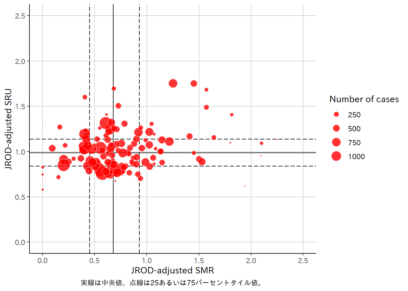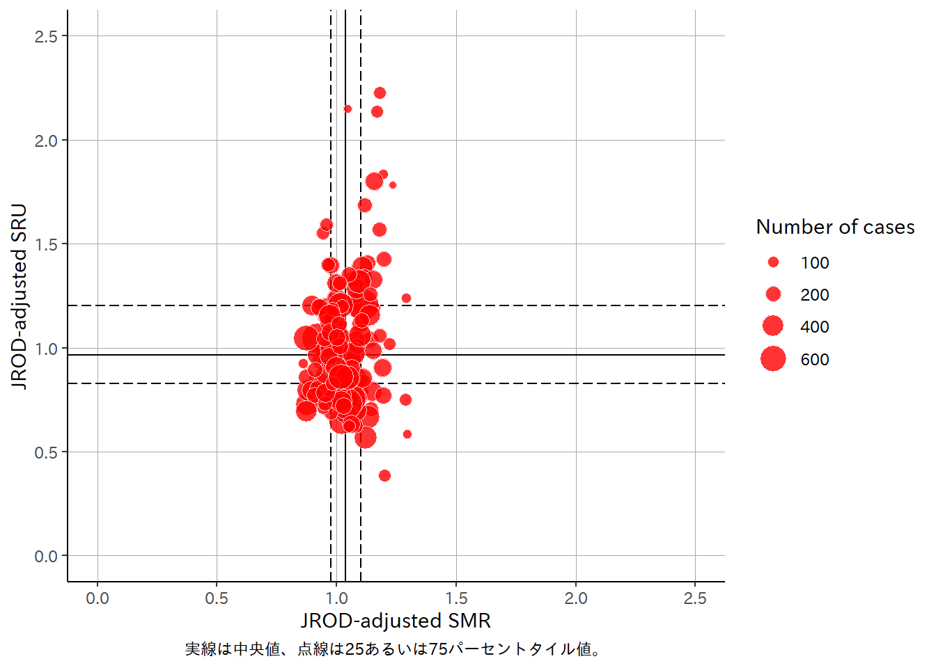 • このファンネルプロット(Funnel Plot)は、JROD予測死亡率に基づく標準化死亡比(SMR, Standardized Mortality Ratio)のばらつきを病院ごとに可視化するためのものである。